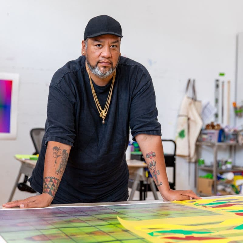 Jeffrey Gibson grew up in major urban centres in the United States, Germany, and Korea, and he now lives and works near the Hudson Valley region of New York state. For over two decades, Gibson has evolved an aesthetic that examines our armatures of meaning, from language and text to pattern and music, and how they act as interlocutors with the world around us. He is celebrated for his work in painting, video, performance, and installation, which combine vibrant color, complex pattern, and both sourced and original text with found objects and sound to invoke and interweave such disparate contexts as faith-based spaces of communion and night clubs. His work is included in the permanent collections of the Museum of Modern Art, the National Gallery of Art, and Whitney Museum of American Art, among others, and has been exhibited widely, including the 2024 U.S. Pavilion at the 60th Venice Biennale, where he was selected to represent the United States with a solo exhibition. He holds an MFA from the Royal College of Art, London (1998) and a BFA from the School of the Art Institute of Chicago (1995). Gibson has received many distinguished awards, including a John D. and Catherine T. MacArthur Foundation Fellowship Award (2019) and a Joan Mitchell Foundation Painters and Sculptors Grant (2012).